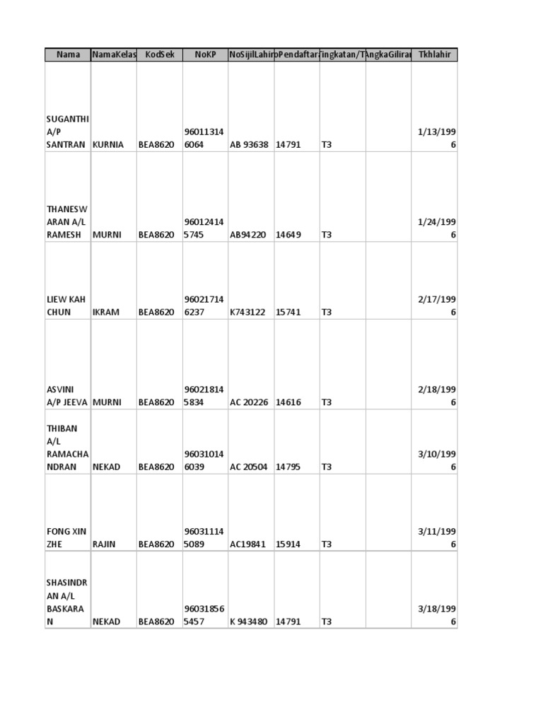 Tingkatan 3 2012 As At 03022012
