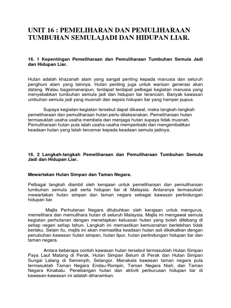 Unit 16 Pemeliharan Dan Pemuliharaan Tumbuhan Semulajadi Dan Hidupan Liar